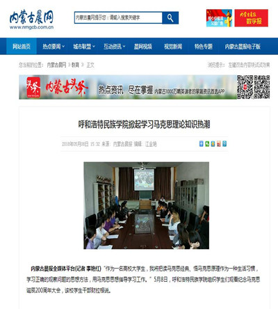 5月4日上午,我校第一時間組織廣大干部師生收看紀念馬克思200周年大會,集中學習了習近平總書記在紀念馬克思誕辰200周年大會的講話。習近平總書記的講話在廣大干部師生中引起了強烈反響,受到媒體的廣泛關注。 中國新聞網、內蒙古晨網等媒體對我校開展廣大干部師生收看紀念馬克思誕辰200周年大會活動進行了報道。