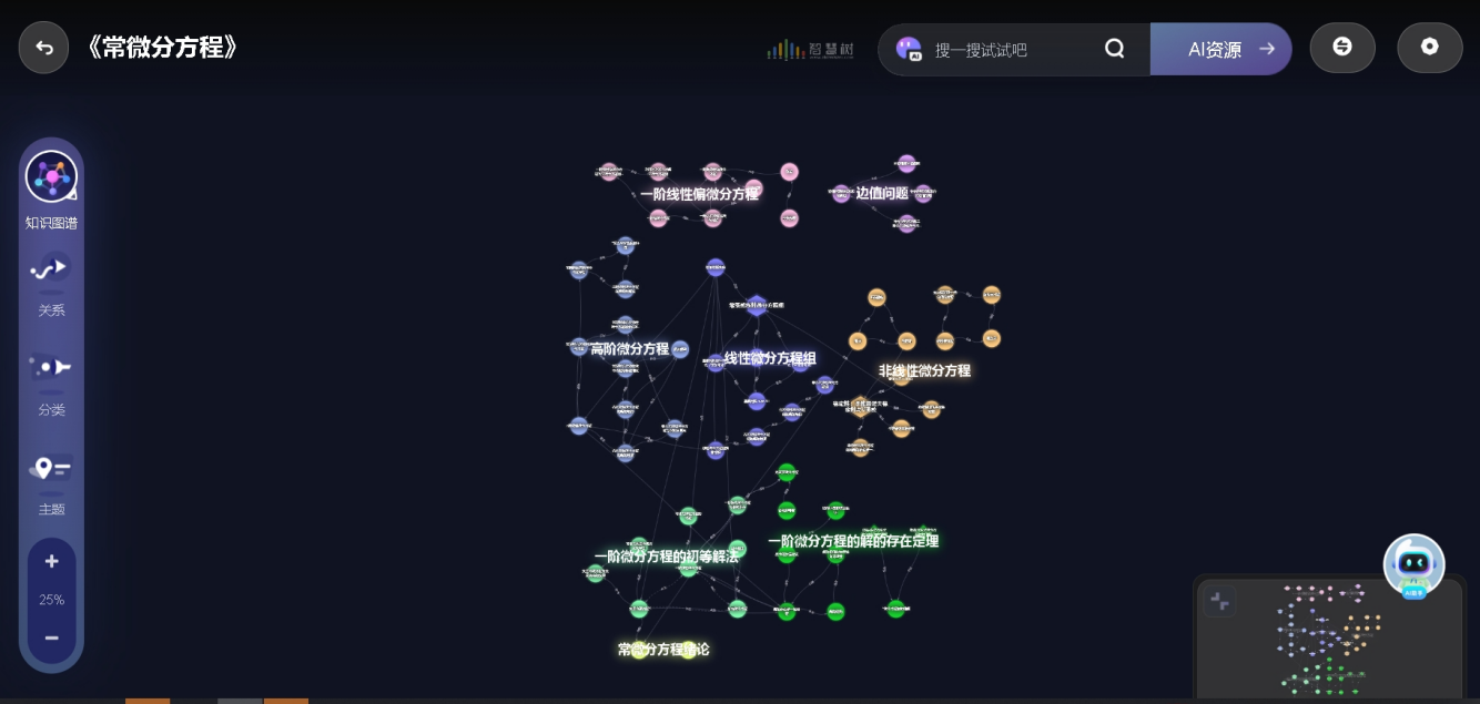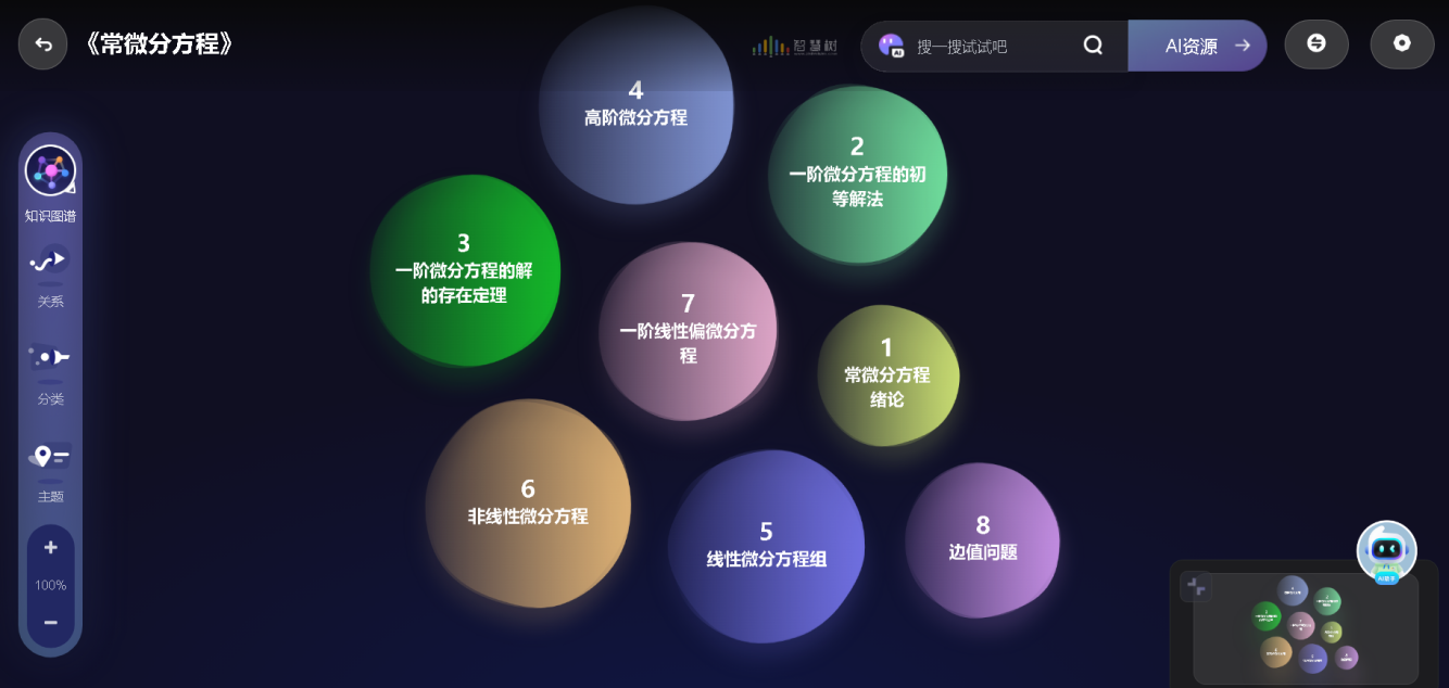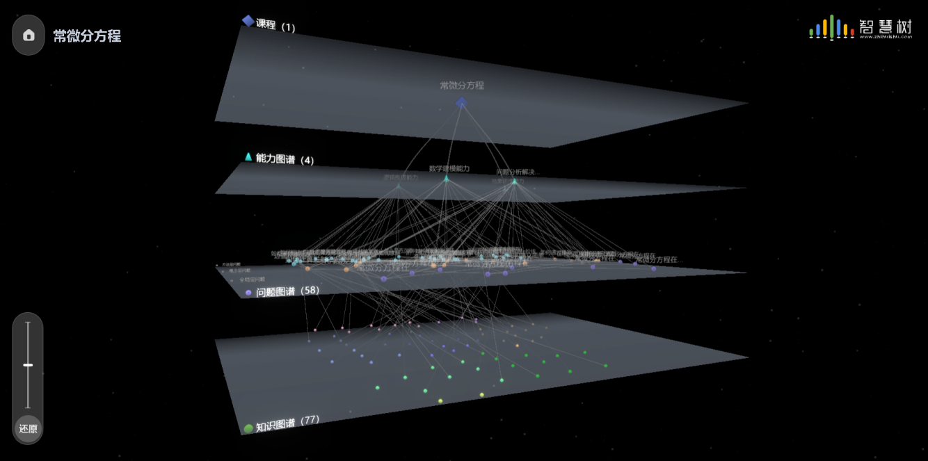 本課程為3學分,64學時。全課以方程為軸線,串起基礎內容、應用案例和拓展知識。課程依托知識圖譜,凝練77個知識點、嵌入掛載321個教學資源、鏈接知識關系88個、匹配422道測試題目、融入58個問題,增加了AI助手答疑功能。作為方程類課程,它與數學分析、高等代數、解析幾何等先修課和數學物理方程、泛函分析、數學建模、微分幾何、數值分析等后繼課有著密切的關系,發揮著數學類專業知識體系的重要橋梁作用。