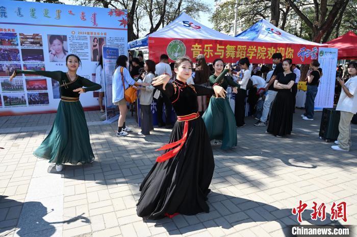8月30日,內蒙古呼和浩特市,學姐們表演蒙古族舞蹈歡迎新同學。中新社記者 劉文華 攝
