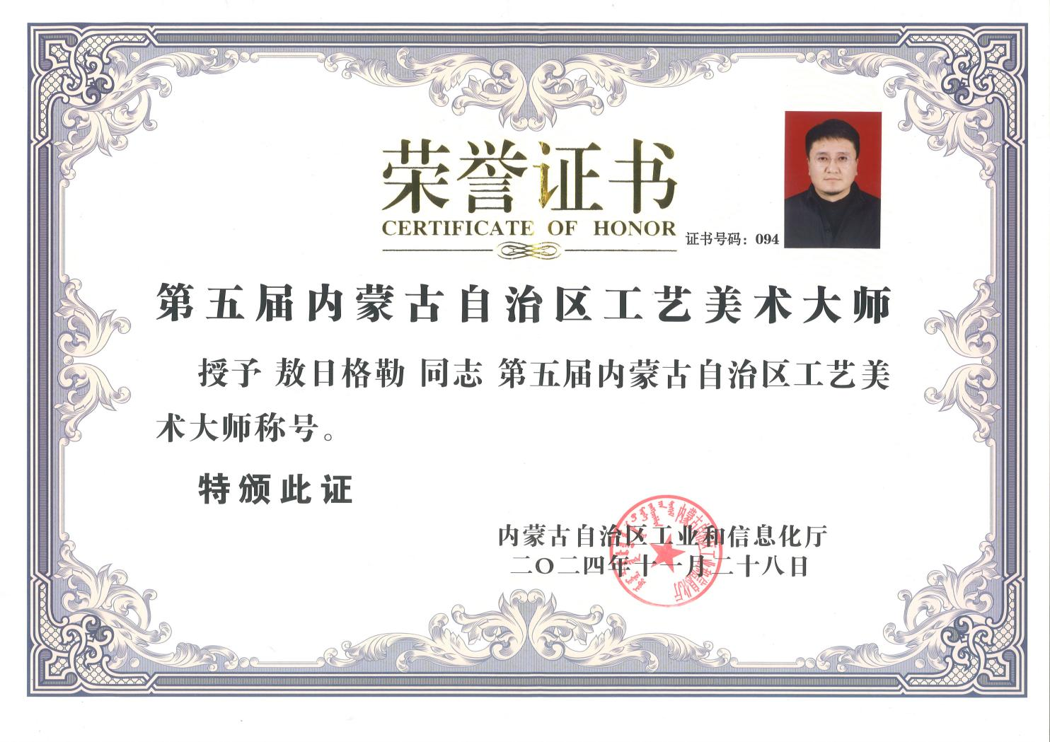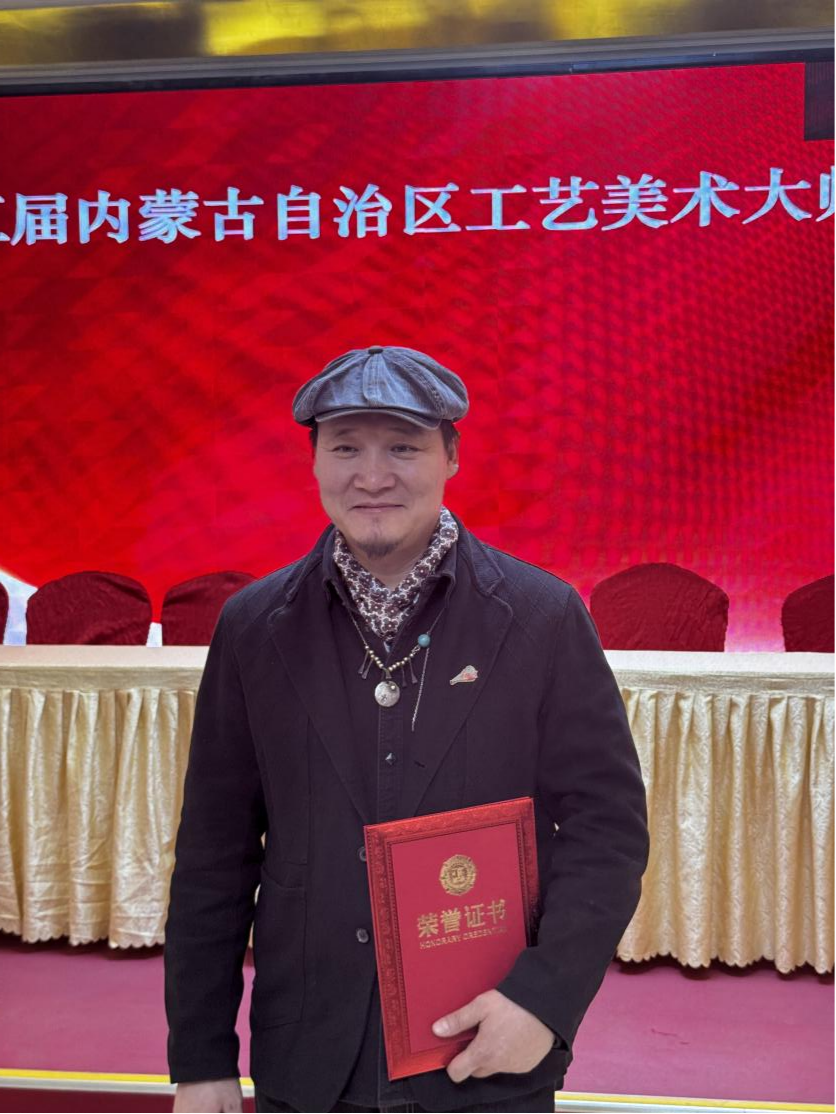 敖日格勒:中國民間文藝家協會會員。內蒙古民間文藝家協會理事。內蒙古工藝美術協會理事。自治區工藝美術大師、在讀博士、非物質文化傳承人。其作品曾獲得全國銀獎一次、銅獎一次,自治區級金獎4次、銀獎4次。2023年獲得第十三屆薩日納獎。