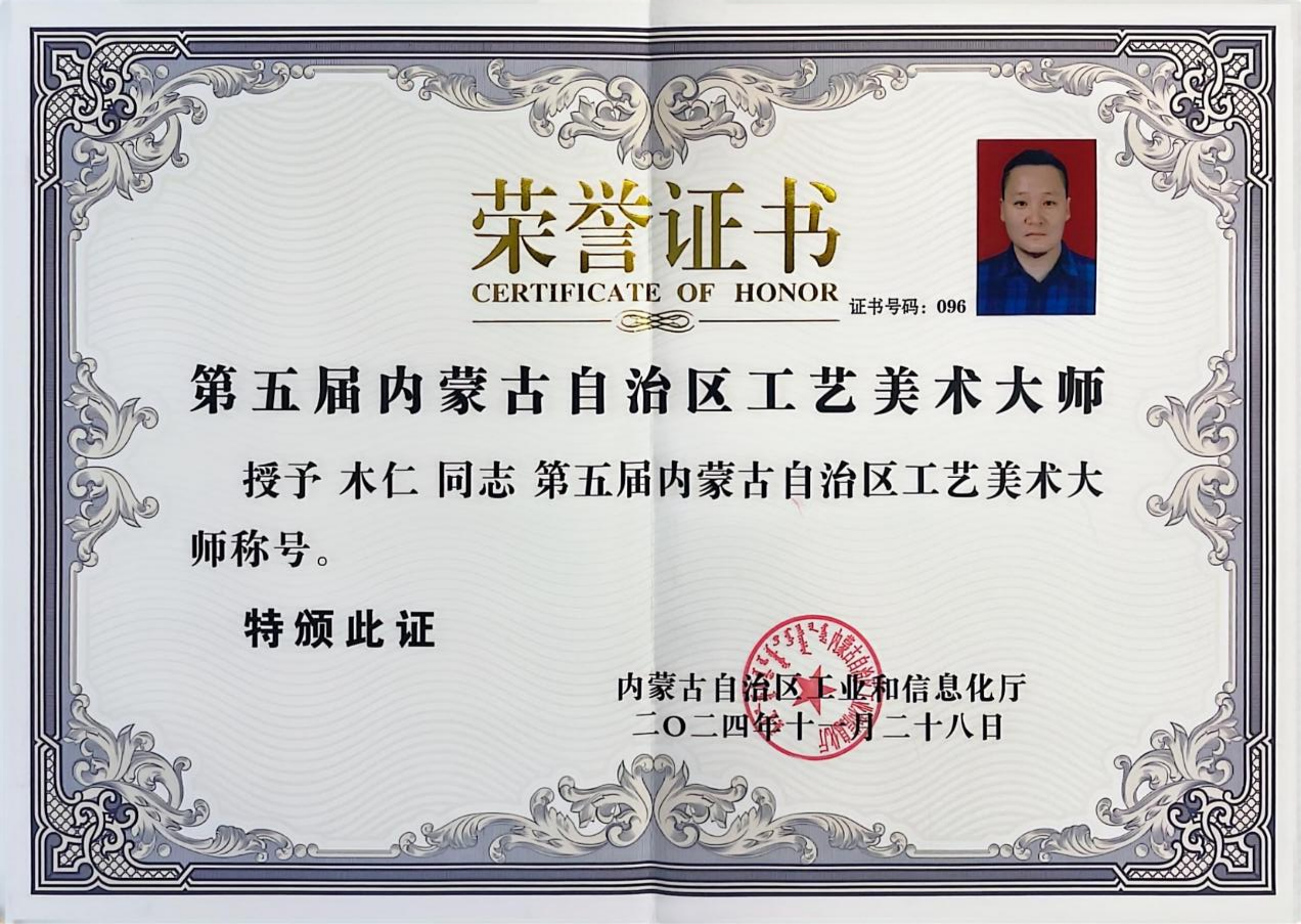 木仁:內蒙古民間文藝家協會會員,內蒙古工藝美術協會常務理事,內蒙古自治區工藝美術大師。省(區)級馬鞍制作技藝代表性傳承人。市級馬鞍制作技藝非遺工坊負責人。自治區級創新工作室帶頭人。其作品曾獲得全國銅獎一次、優秀獎一次、入圍一次,自治區級金獎4次、銀獎8次、特邀獎一次。主持省級課題2項。