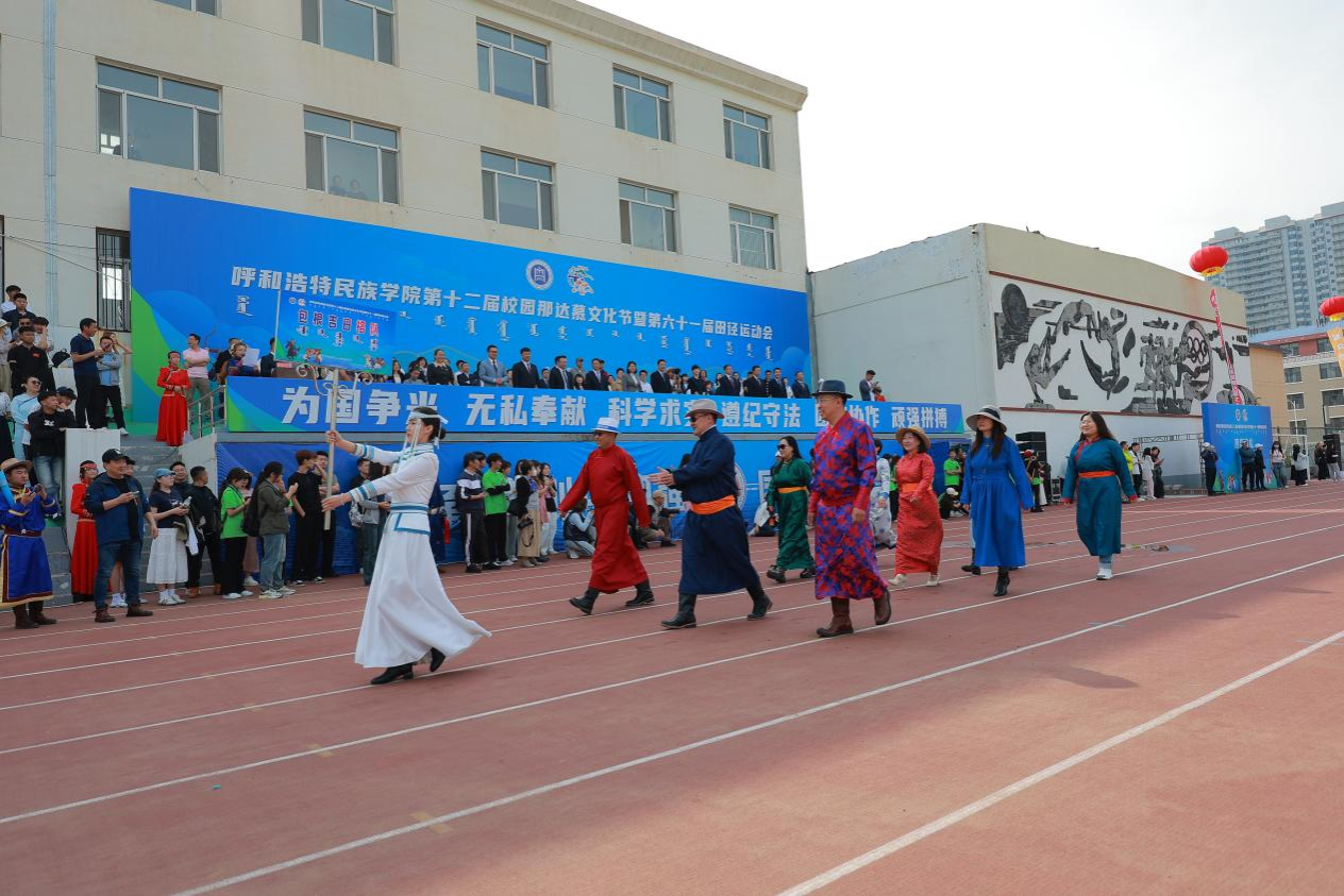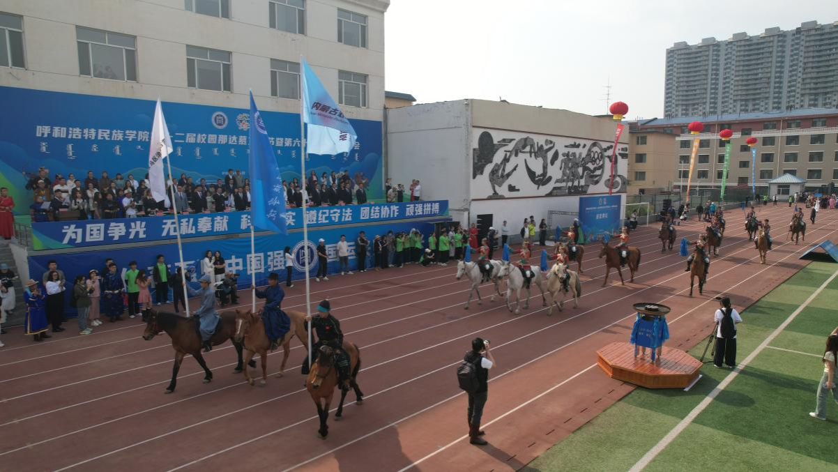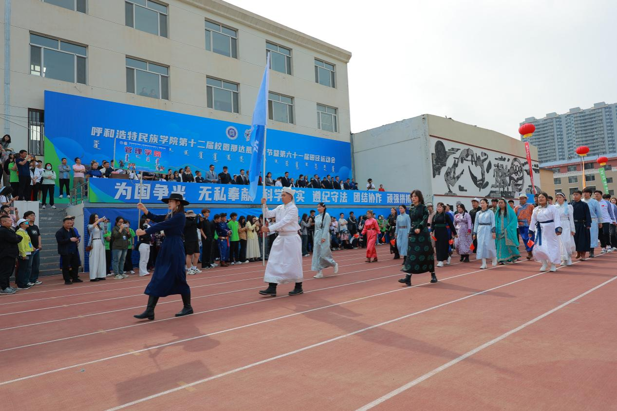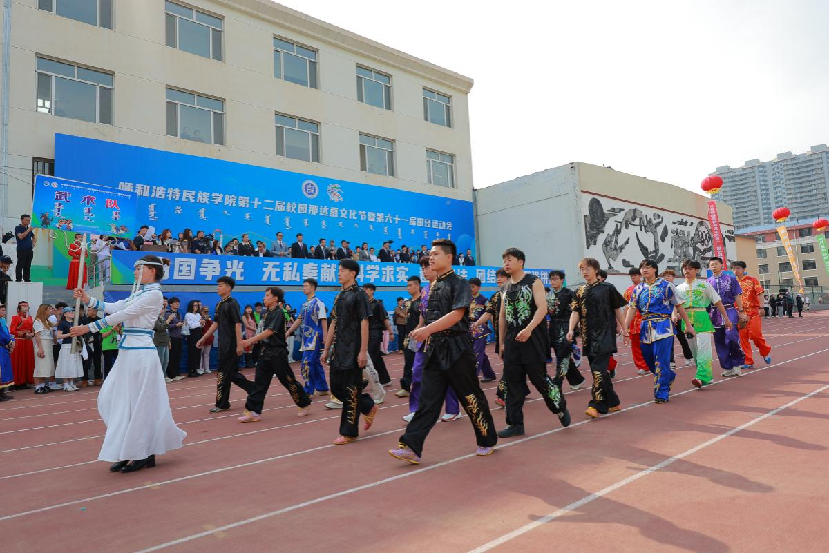 校園夏日,綠意昂揚。5月28日上午,學校舉辦第十二屆校園那達慕文化節暨第六十一屆田徑運動開幕式。校黨委書記劉九萬,黨委副書記、校長王敏,黨委副書記格根哈斯,黨委委員、紀委書記、監察專員王冬梅,黨委委員、副校長高喜天、劉瑞鴻、額爾敦布和、雙虎以及各部門、各學院主要負責人出席開幕式。自治區財政廳、天津工業大學、地方語言文字研究應用中心(內蒙古民族團結雜志社)、內蒙古自治區測繪地理信息中心、內蒙古自治區住房資金中心、呼市公交公司、呼市中醫蒙醫醫院的相關領導和嘉賓也蒞臨活動現場。開幕式由王冬梅主持。71萬+人次觀看現場圖片直播,內蒙古日報、內蒙古新聞網、草原云等多家自治區主流媒體各類平臺宣傳發布我校此次活動。