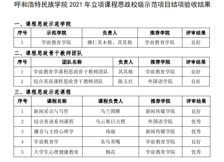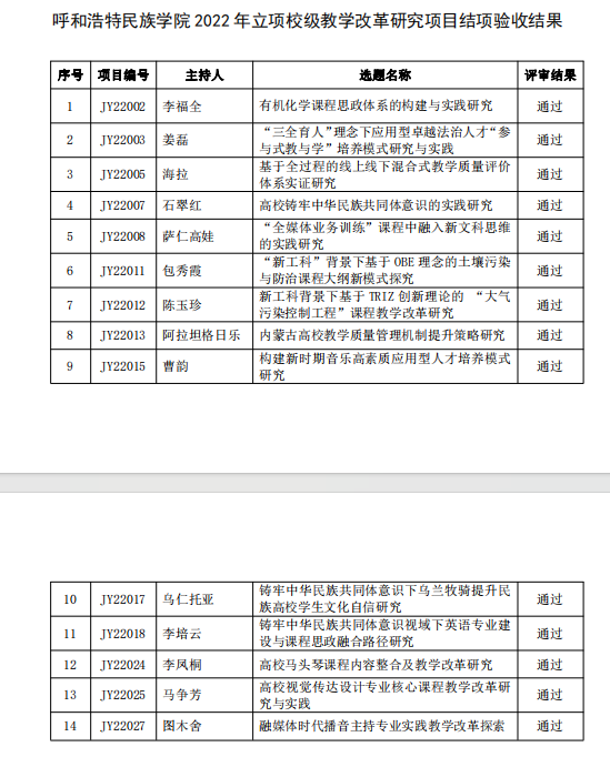 根據(jù)《關于開展呼和浩特民族學院 2024 年課程思政示范建設項目結項及中期檢查工作的通知》(呼和民院教務〔2024〕36 號)和《關于開展 2024 年度呼和浩特民族學院教學改革研究項目申報立項與結項驗收工作的通知》(呼和民院教務〔2024〕41 號),學校組織教學指導委員會開展了2021 年立項的課程思政校級示范項目、2022 年立項的校級教學改革研究項目結項驗收工作。現(xiàn)對評審結果予以公布(名單詳見附表)。