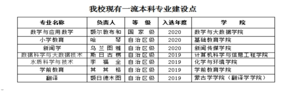 近日,自治區教育廳轉發《教育部辦公廳關于公布2020年度國家級和省級一流本科專業建設點名單的通知》(內教高函〔2021〕10號),公布了2020年度國家級、省級一流本科專業建設點。我校數學與應用數學專業獲批國家級一流本科專業建設點,實現了學校國家級一流本科專業建設點零的突破。我校小學教育、新聞學專業獲批省級一流本科專業建設點。截至目前,我校有國家級一流本科專業建設點1個,省級一流本科專業建設點6個。