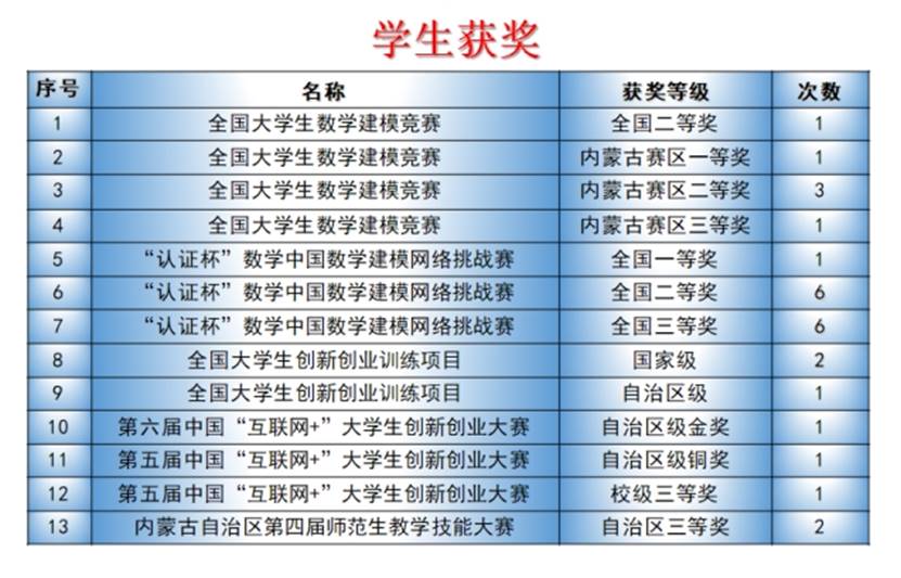 天道酬勤,一樹百獲。近幾年,該專業師生先后獲得全國高校數學微課程教學設計競賽全國一、二等獎;全國大學生數學建模競賽二等獎等50多項省部級各類獎項;現有自治區高等學校在線開放課程2門(2018年)和精品在線開放課程(金課)1門(2021年);建設自治區高等學校實驗教學示范中心(2017年)1個和教育部民族教育發展中心重點研究基地(2015年)1個,掛靠學校成立內蒙古高等教育學會數學教育分會(2016年);先后20多名學生考取太原理工大學、陜西師范大學、內蒙古大學等高校碩士研究生,其中3人分別直推為武漢科技大學和內蒙古大學的博士研究生。特別是,2018年實現學校高等教育自治區級教學成果一等獎零的突破。
