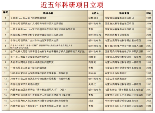 研精殫思,碩果累累。近五年,該專業團隊成員先后獲批國家自然科學基金項目3項、全國民族教育研究課題1項、教育部協同育人項目1項、自治區人才項目2項、自治區自然科學基金項目2項和其它省部級教學科研項目20多項;在《中國科學》《數學學報》《journal of mathematical analysis and applications》等國內外刊物上發表學術論文70多篇,其中SCI收錄30多篇;出版教材和專著5部;邀請中國科學院張恭慶院士等國內外專家學者40余人次,組織參加各類教學科研會議50余人次,承辦第八屆非線性數學物理國際會議暨全國第十五屆可積系統學術研討會(2019年)等會議。2019年,數學學科獲批為國家民委重點學科。