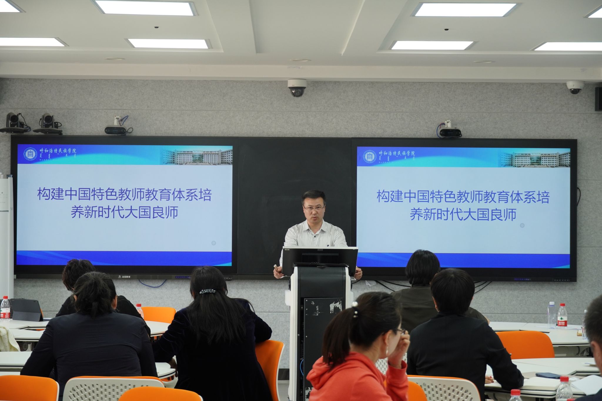 額爾敦布和以《構建中國特色教師教育體系培養新時代大國良師》為題作了專題輔導講座,并就師范類專業認證工作提出三點意見:一是要以“認證標準”為尺度,全面部署師范類專業認證工作;二是要以“主線與底線”為抓手,系統梳理佐證材料和問題清單,按時完成自查自評和整改工作;三是要以“五個度”為準線,全鏈條整體推進參與認證和整改工作。