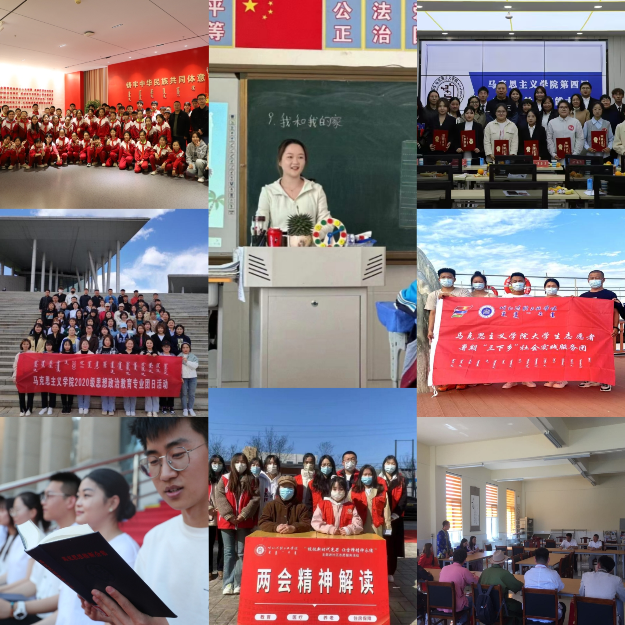 本專業注重實踐性,在呼和浩特市、鄂爾多斯市鄂托克前旗、杭錦旗、興安盟科右前旗、科右中旗、通遼市科左后旗、通遼市庫倫旗設有28個實習(實訓)基地,為學生提供了良好的實習、實訓平臺。近年來,本專業學生參加全國高校思政教育師范生技能測試暨微課比賽二等獎1人、三等獎5人;參加自治區大學生講思政課比賽獲一等獎2項、二等獎5項、三等獎5項;參加學校師范生技能大賽獲得一等獎4人、二等獎3人、三等獎5人;參加“挑戰杯”全區大學生創業計劃競賽獲得三等獎3項;參加學校第六屆互聯網+大學生創新創業大賽獲得三等獎1項,獲批自治區級大學生創新創業訓練項目4項,校級訓練項目2項。2016級思想政治教育班獲全國活力團支部獎,馬克思主義學院志愿者服務隊獲得2019年全區大中專學生志愿者暑期“三下鄉”社會實踐活動“優秀志愿者服務隊”等榮譽。