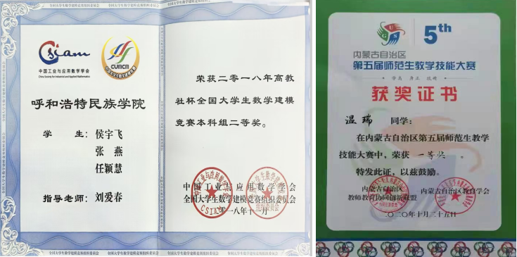 2015年我校成為全國高校數學類課程教學指導委員會秘書單位。2016年掛靠學校成立內蒙古自治區高等教育學會數學教育分會,由中國科學院院士張恭慶教授擔任名譽會長。學院依托內蒙古自治區高等教育學會數學教育分會,積極組織開展數學教育教學研究及各類研討交流活動,為全區高校數學教師搭建交流與成長平臺。學院先后選派多名教師到大連理工大學、西安交通大學、西北師范大學等高校參加培訓學習,加強教師教育教學以及科研能力培養與提升。學院黃大年式教師團隊教師獲得全國高校數學微課程教學設計大賽全國一等獎1項、二等獎1項和華北賽區特等獎2項、一等獎2項、二等獎1項,獲得自治區高校青年教師教學技能大賽二等獎2項、教學創新大賽二等獎2項。