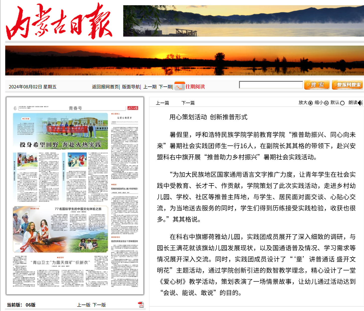 學(xué)院以黨團(tuán)班一體化為抓手,聚焦鑄牢中華民族共同體意識(shí)主線,通過(guò)團(tuán)日活動(dòng)和學(xué)校一站式學(xué)生社區(qū)建設(shè),構(gòu)建五育融通、數(shù)字賦能的育人新生態(tài)。其中五線聯(lián)動(dòng)?教育賦能實(shí)踐團(tuán)組織47名師生分赴5個(gè)盟市,開(kāi)展普通話推廣、民族團(tuán)結(jié)教育等實(shí)踐活動(dòng),累計(jì)服務(wù)800余人次,獲地方政府高度評(píng)價(jià),充分彰顯實(shí)踐育人成效。