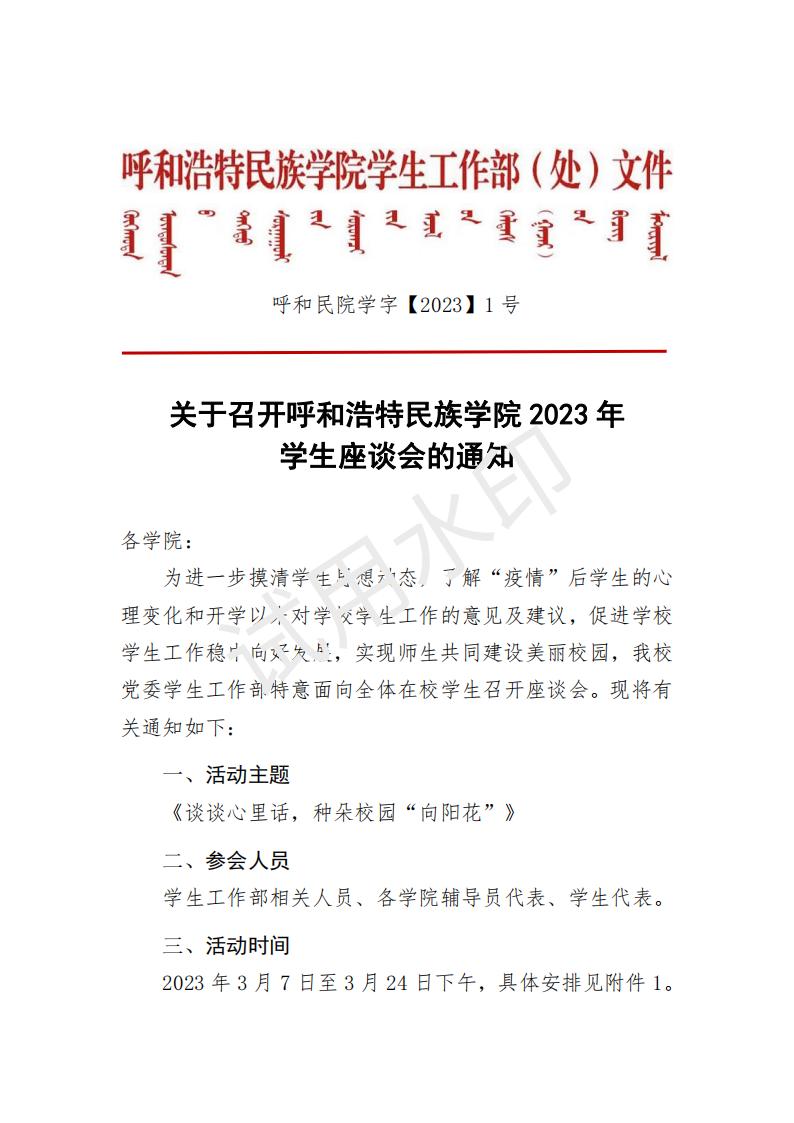 上一條:關于召開呼和浩特民族學院2023年 學生座談會的通知 下一條:關于舉辦2023年“迎新杯”籃球比賽的通知