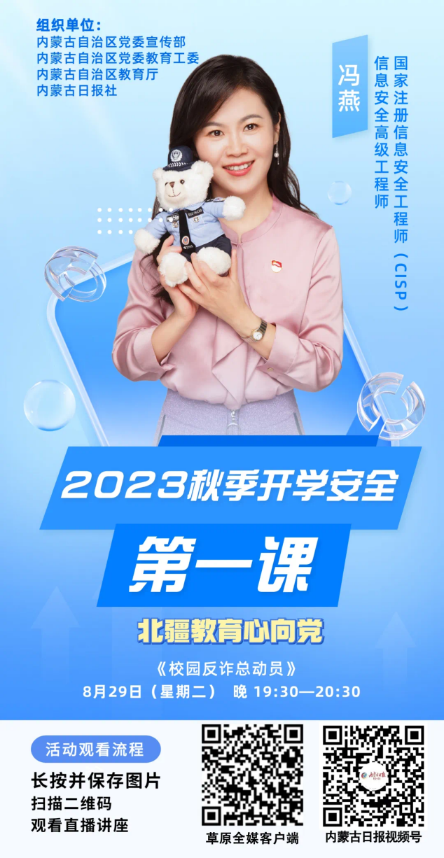 隨著互聯網技術的快速發展,網絡詐騙手段層出不窮。為增強全體學生的網絡安全意識,提高自我保護意識,以良好的精神面貌投入新學期的學習生活。自治區教育廳特邀專家為大家講授以“北疆教育心向黨——校園反詐總動員”為主題的開學第一課直播。現將有關事項通知如下。