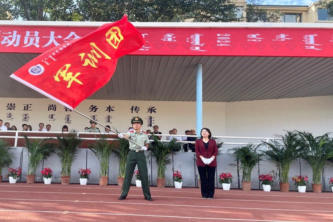 9月2日,學校2024級新生軍訓動員大會在學校北操場隆重舉行。學校黨委副書記、軍訓團政委格根哈斯出席大會,并向軍訓團授旗。學校國防教育工作領導小組全體成員,各學院黨總支書記、副書記、學工辦主任、團總支書記、輔導員、2024級新生班主任以及全體新生共計2600余人參加了大會。