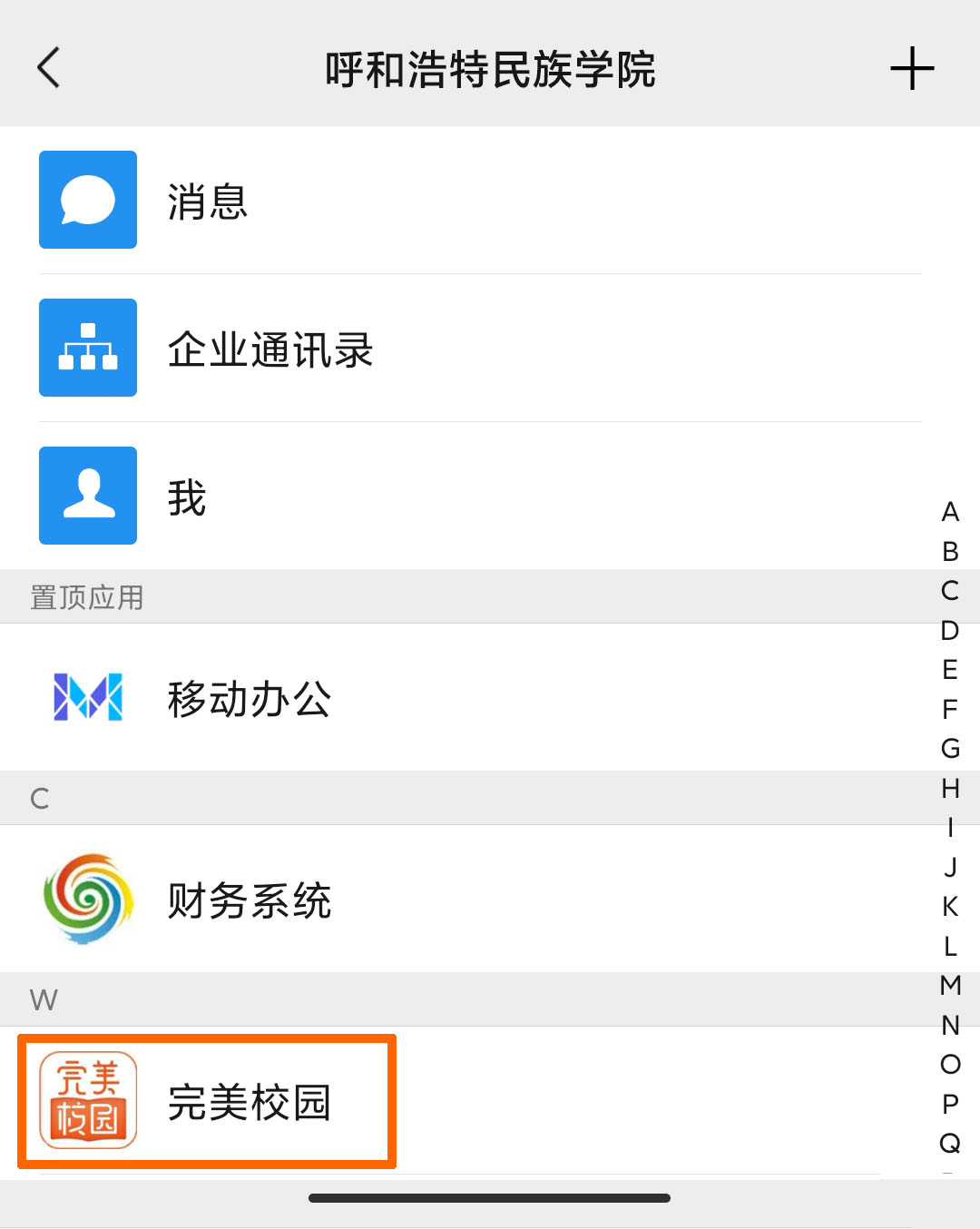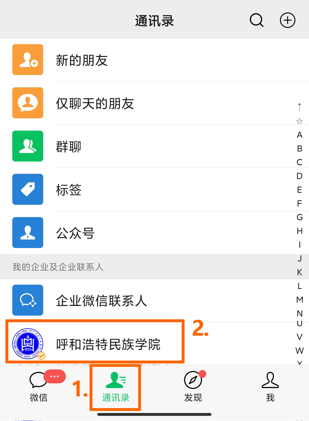 微信上打開(kāi)“通訊錄”點(diǎn)擊“呼和浩特民族學(xué)院”