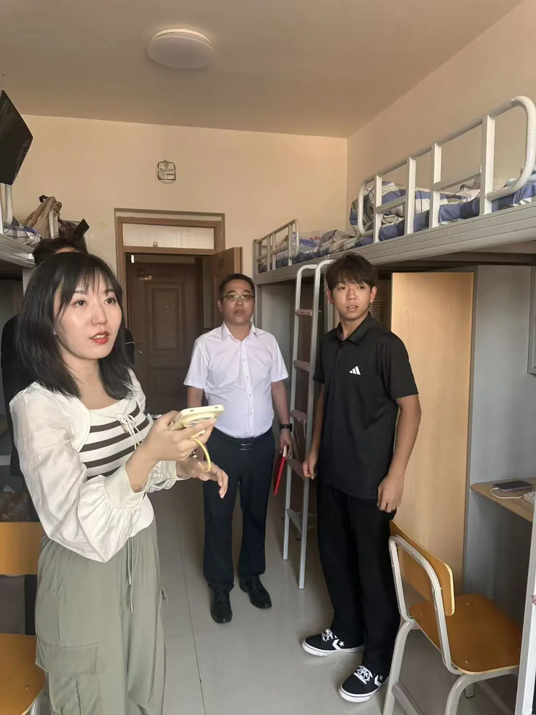 新生見面會結束后,學院領導與各班班主任共同前往新生宿舍走訪。他們現場檢查住宿設施,傾聽學生的實際訴求,還親切提醒新生需在宿舍生活中互幫互助、樹立集體觀念,助力大家更快融入大學新環境,讓學院的關愛直達新生心中。