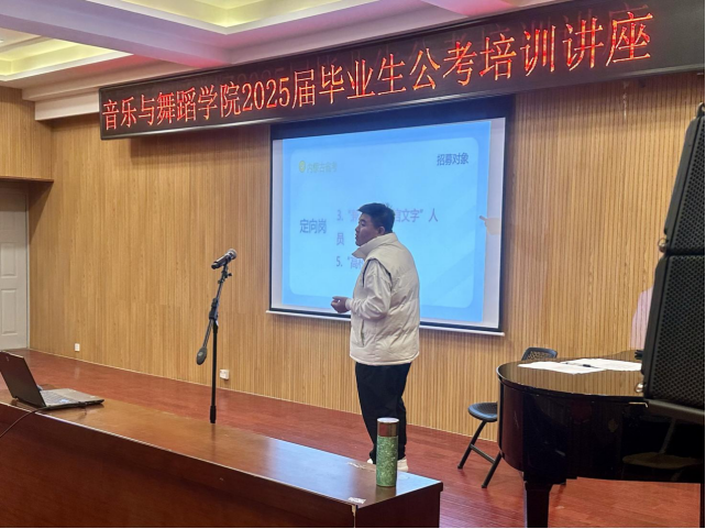 為進一步提升廣大學生的就業競爭力,深入了解公務員、事業單位考試的備考政策,加強畢業生應考能力。11月13日晚,音樂與舞蹈學院在音樂樓多功能廳邀請了蒙政公考塔拉講師為同學們作考公專題知識講座,2025屆全體畢業生參加了此次講座。