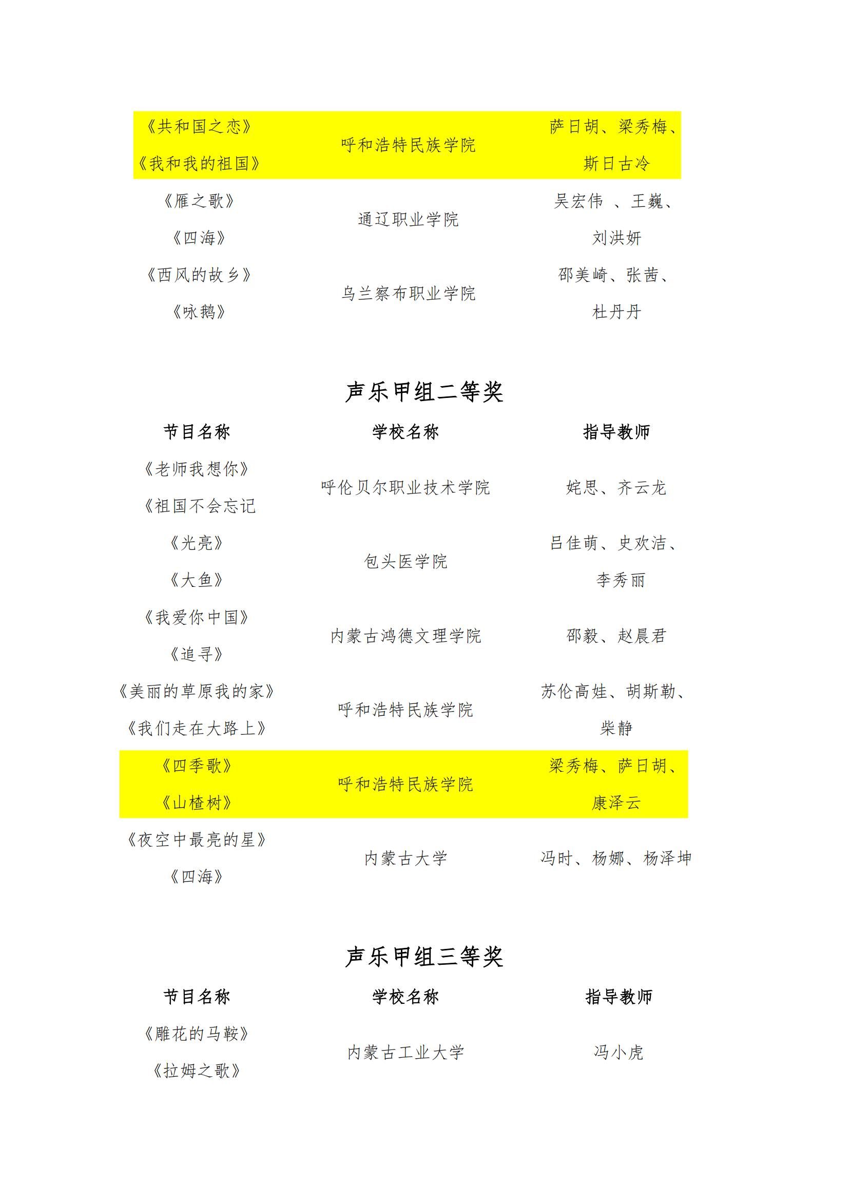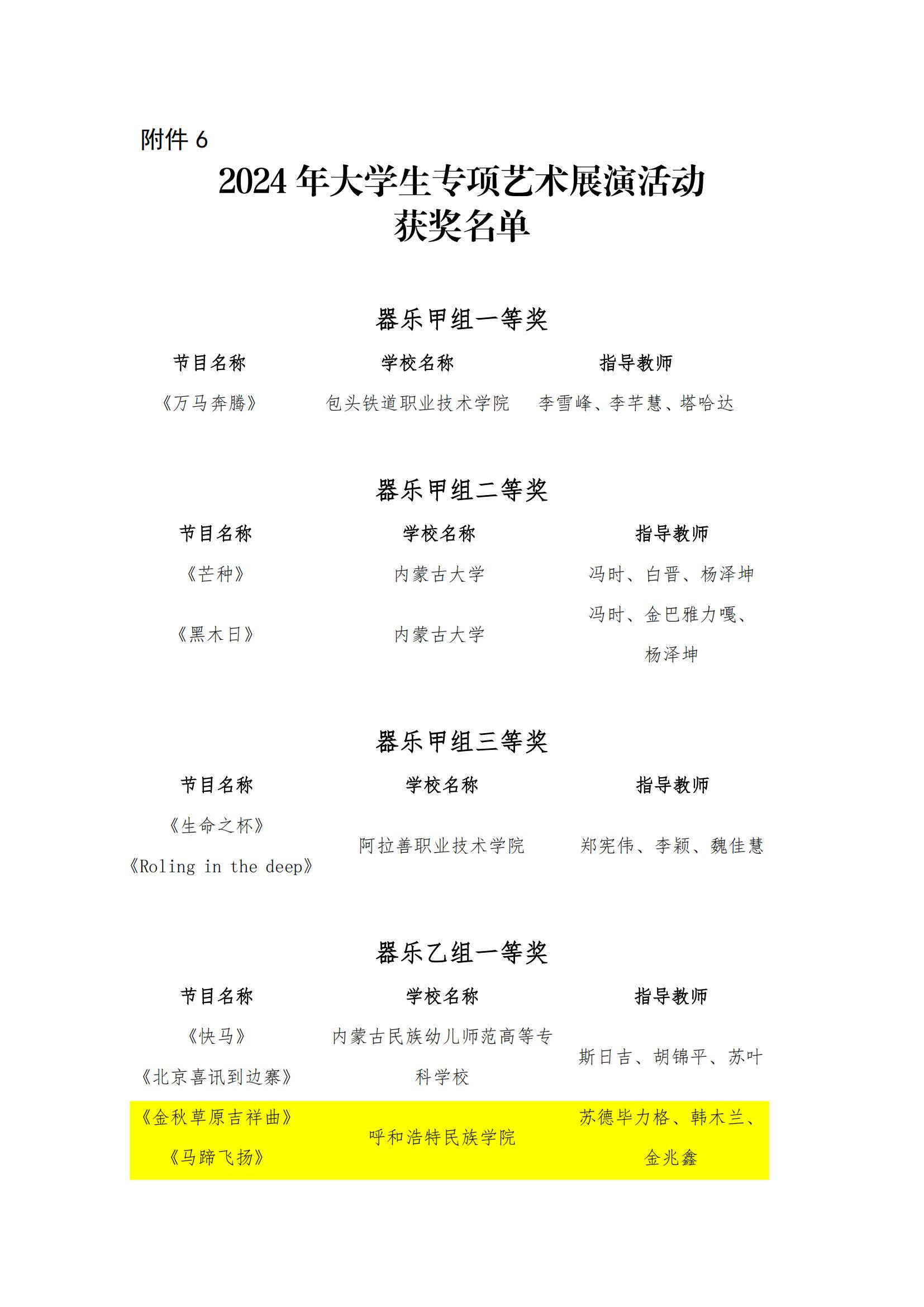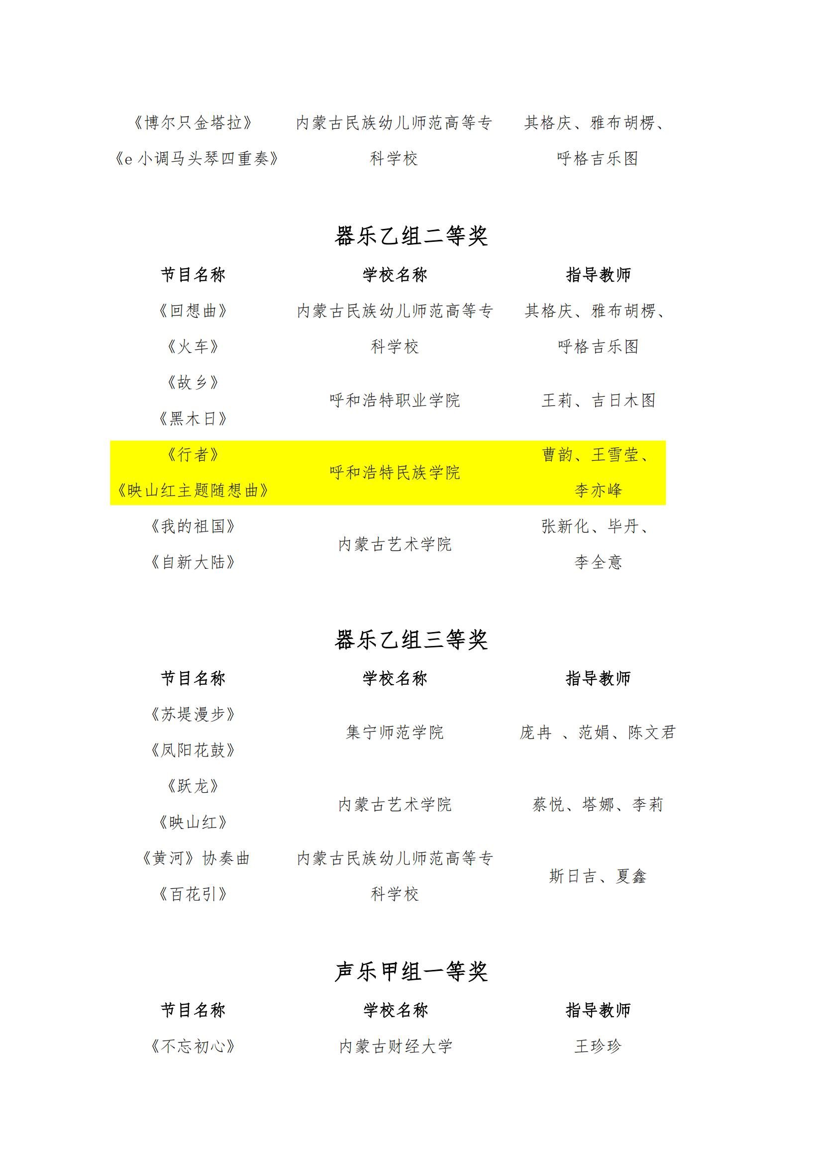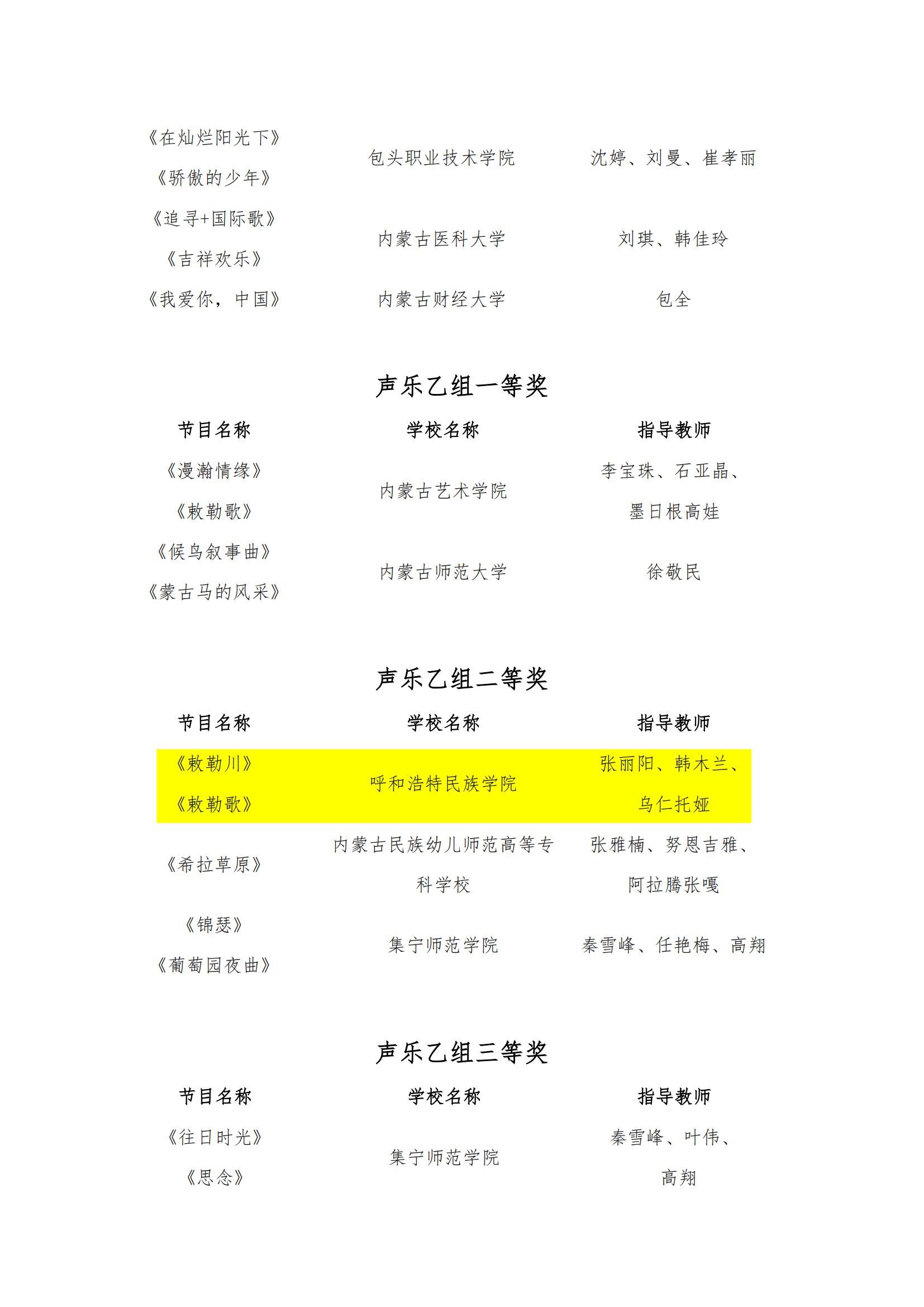 我院教師蘇德畢力格、韓木蘭、金兆鑫指導(dǎo)的《金秋草原吉祥曲》《馬蹄飛揚》作品榮獲大學(xué)生專項藝術(shù)展演活動器樂乙組一等獎;曹韻、王雪瑩、李亦峰指導(dǎo)的《行者》《映山紅主題隨想曲》榮獲器樂乙組二等獎;梁秀梅參與指導(dǎo)的《共和國之戀》《我和我的祖國》榮獲聲樂甲組一等獎,《四季歌》《山楂樹》榮獲聲樂甲組二等獎;張麗陽、韓木蘭、烏仁托婭指導(dǎo)的《敕勒川》《敕勒歌》榮獲聲樂乙組二等獎。取得了我校在全區(qū)藝術(shù)類展演活動上的新突破。