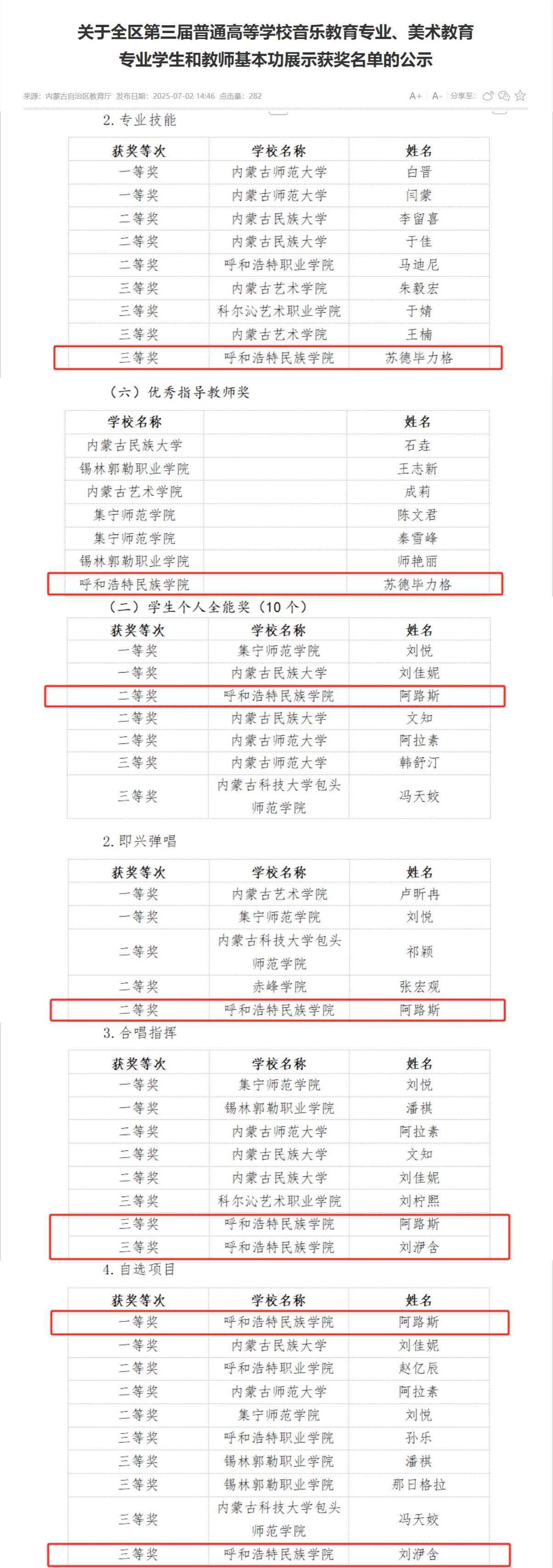 我院師生在本次全區(qū)技能展示的競技舞臺上突破自我、奮勇爭先,榮獲多項(xiàng)佳績。蘇德畢力格老師獲得音樂教育專業(yè)教師專業(yè)技能展示三等獎;阿路斯同學(xué)榮獲音樂教育專業(yè)學(xué)生專業(yè)技能展示(自選項(xiàng)目)一等獎、個(gè)人全能二等獎、即興彈唱二等獎,以及合唱指揮三等獎;劉洢含同學(xué)榮獲音樂教育專業(yè)學(xué)生專業(yè)技能展示(自選項(xiàng)目)三等獎,合唱指揮三等獎。