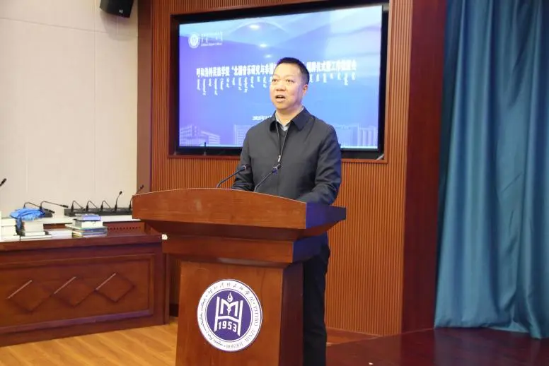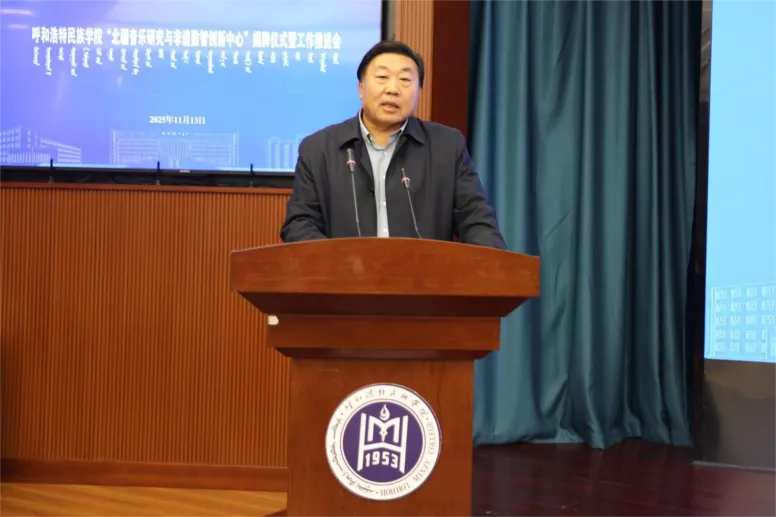 2025年11月13日下午,呼和浩特民族學院“北疆音樂研究與非遺數智創新中心”揭牌儀式及工作推進會在綜合樓1211(5號)會議室舉行。學校黨委委員、副校長雙虎,內蒙古自治區人大教科文衛委員會副主任委員吳海龍,內蒙古師范大學音樂學院楊玉成教授,江西科技師范大學音樂學院哈斯巴特爾教授等區內外專家、學者以及中國音樂學院、內蒙古師范大學、內蒙古藝術學院、呼和浩特民族學院音樂與舞蹈學院師生代表參加了會議。由音樂與舞蹈學院黨總支書記包玉柱主持。